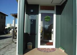 モスグリーンのスパンドレルが張られた外壁と白い窓枠、2階の外壁は下見板張りで、まさに社名の「森の家」の雰囲気が出ていました。
