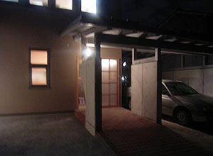 | 玄関ホールから真っ直ぐ伸びた廊下の先に、朱色の額が目に飛び込んでくる。そして、天井に1箇所も照明器具を配しておらず、壁のブラケット照明だけで明るさを演出しています。 | サッシも、木製。羽咋の「森の窓(株)」製品です。 http://www2.nsknet.or.jp/~morimado/index.html |