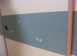 | こちらはアトリエ横の小部屋。ここの扉にもアクセントに唐紙が貼られていました。ここでも統一性をもたせています。 | 和室にある衝立と同じ模様。 | ||